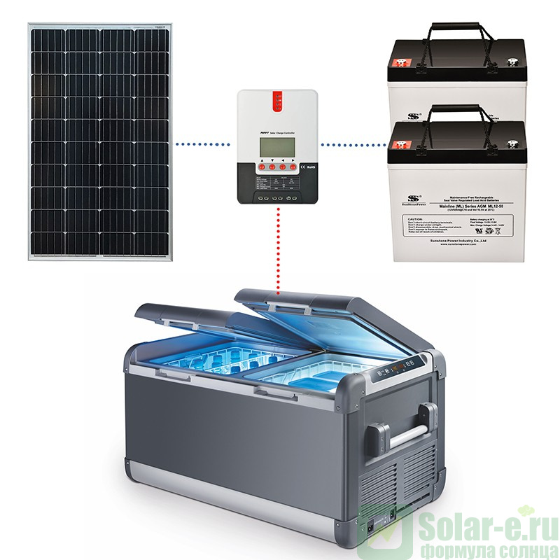 Готовое решение для обеспечения круглосуточного электропитания холодильника с напряжением 12 вольт и энергопотреблением до 100Вт/час. Это надежный, экологически чистый и тихий источник электроэнергии.